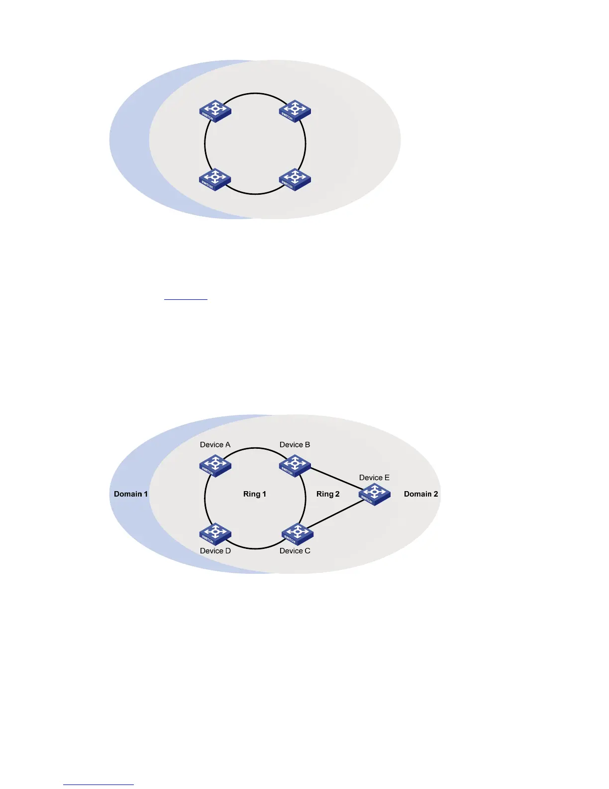 Ring 1 in Domain 2. Device E is configured as the master node of Ring 2 in both Domain 1 and Domain
