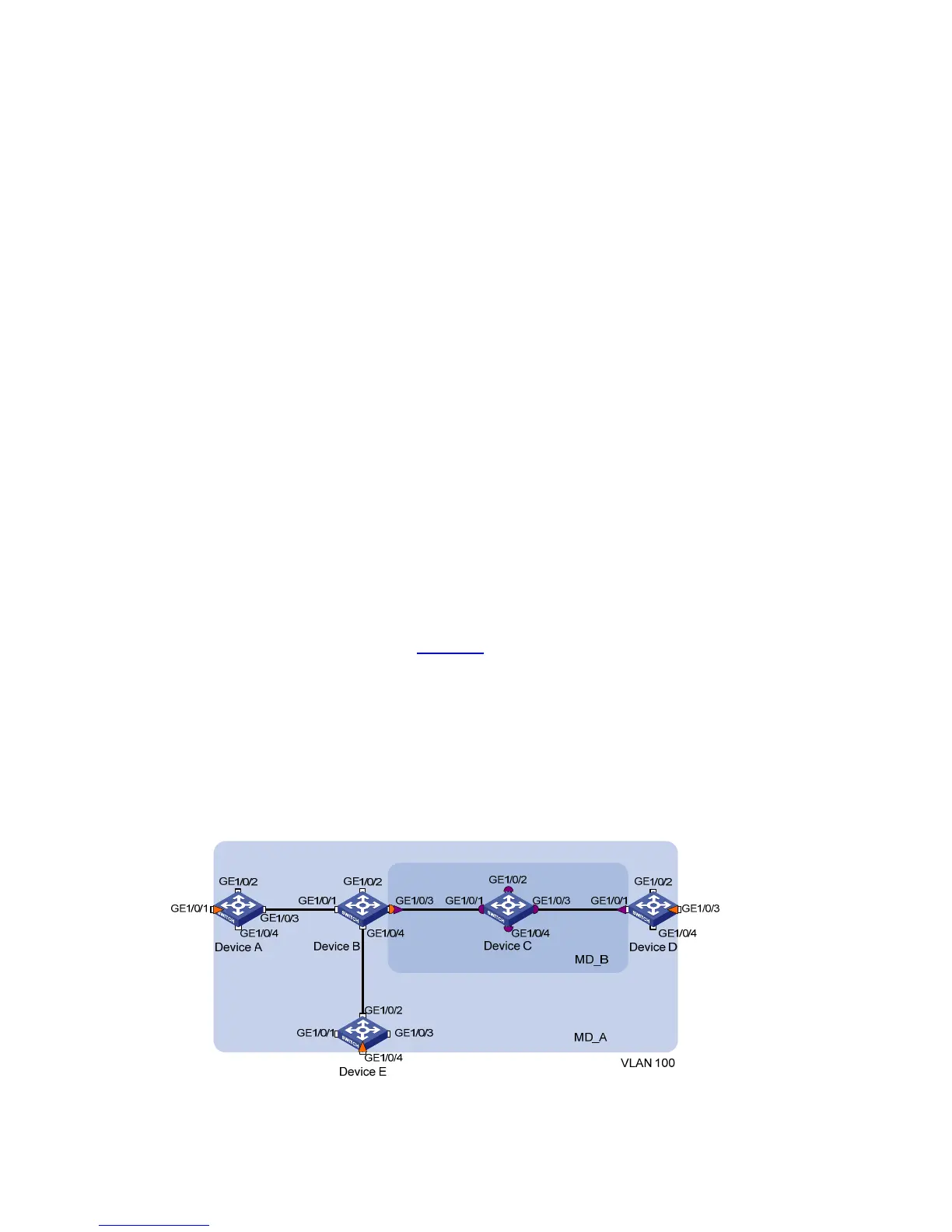 this case, port GigabitEthernet 1/0/3 is configured with MEPs of MD_B, and the MIPs of MD_A