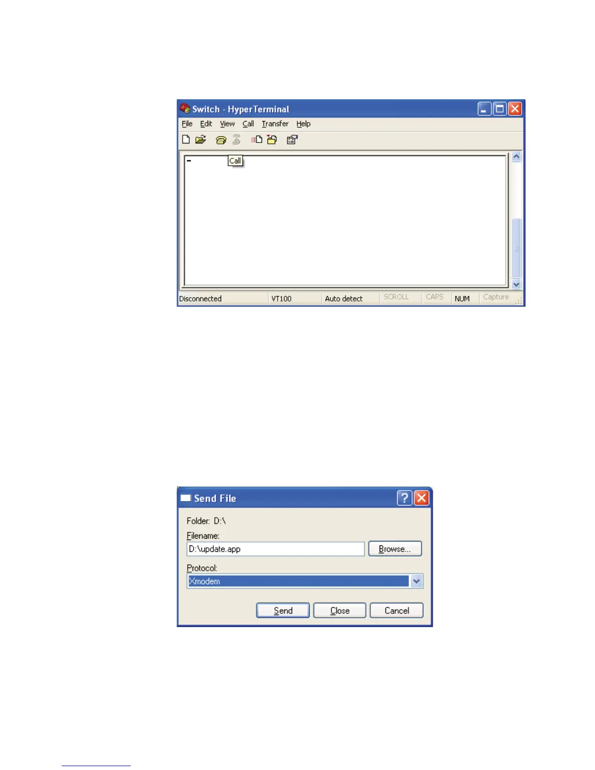 7 Select Transfer > Send File in the HyperTerminal, and in the following popup