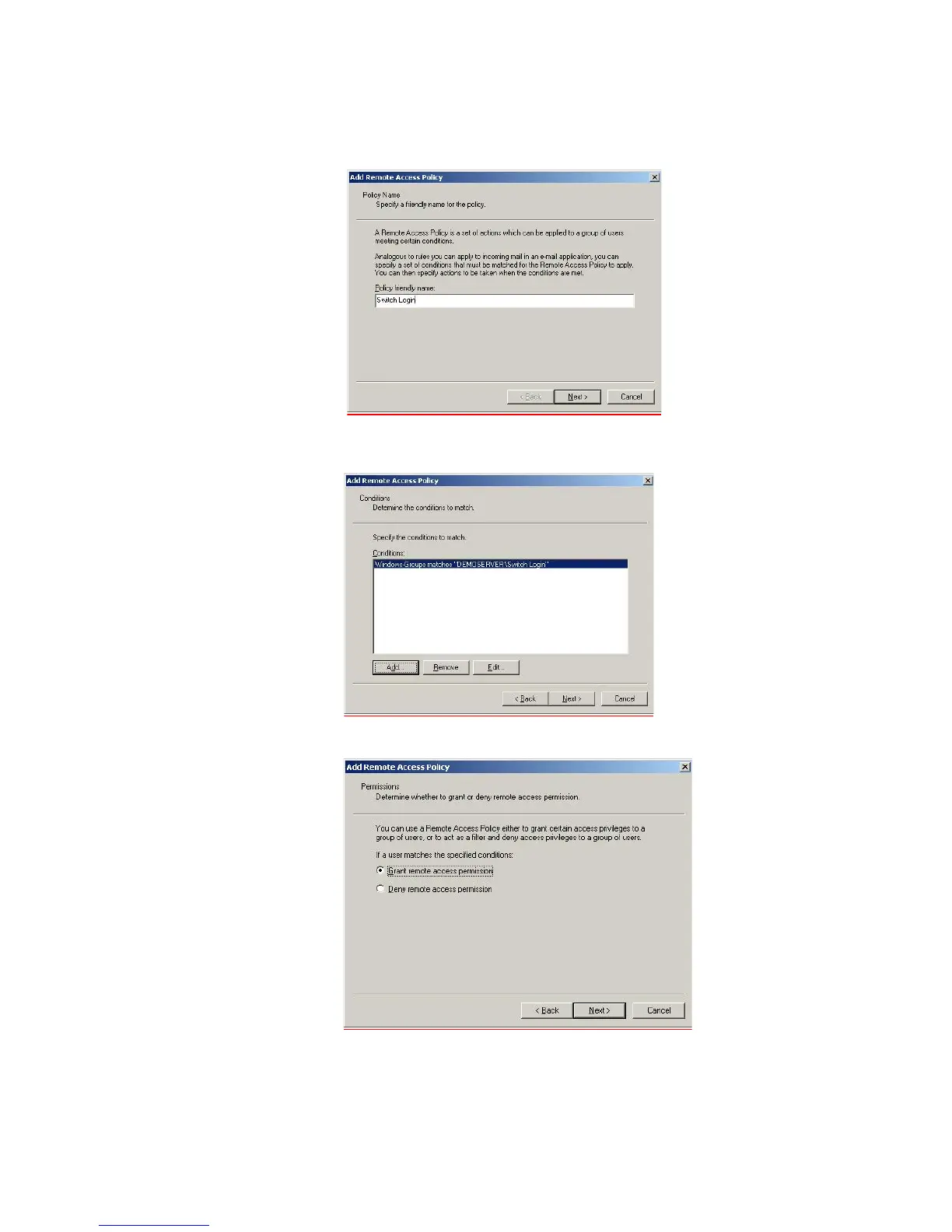 b Create a new remote access policy under IAS and name it Switch Login. Select