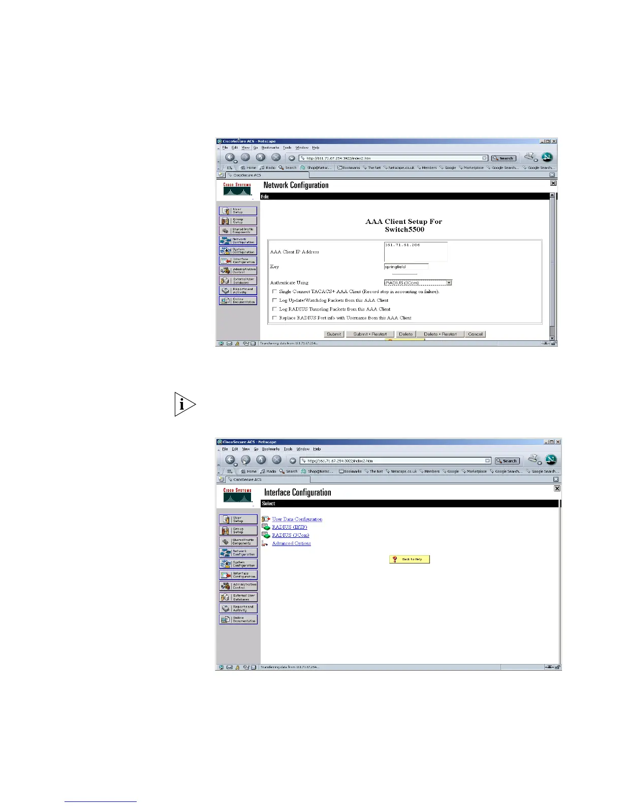 4 Select Interface Configuration, followed by RADIUS (3Com)