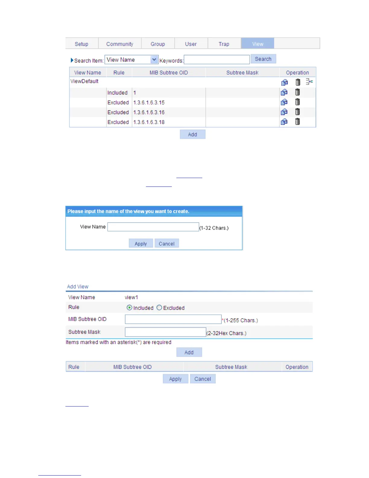 click Apply to crate an SNMP view. Note that the view will not be created if you click Cancel.