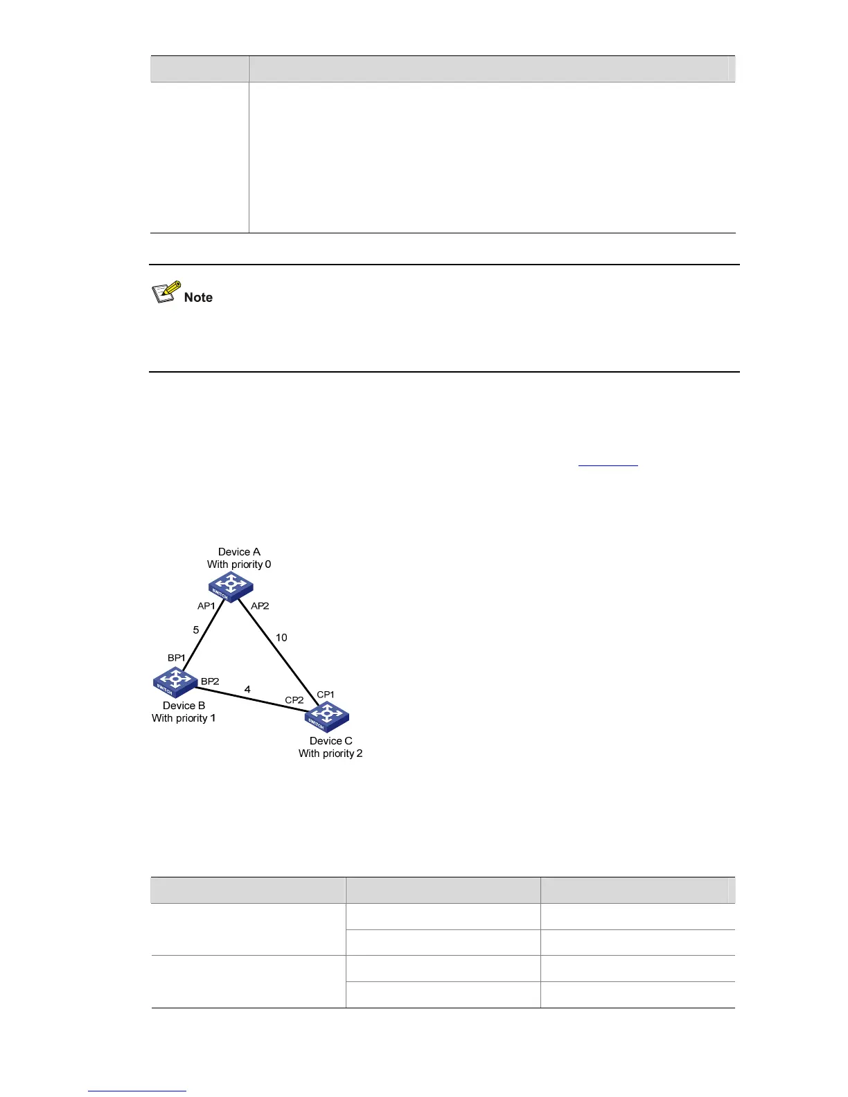 priority of Device A is 0, the priority of Device B is 1, the priority of Device C is 2, and the path costs of