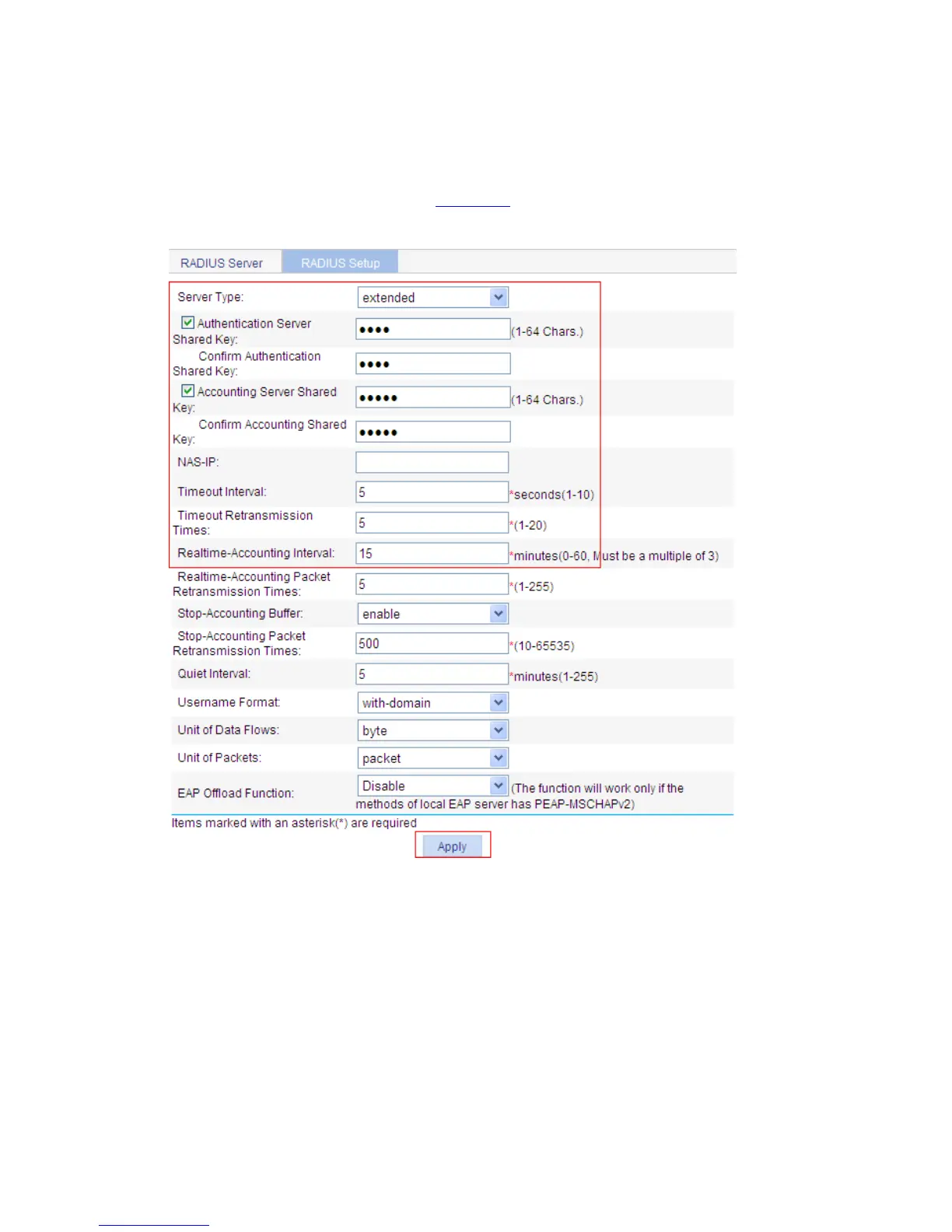 z Select the RADIUS Setup tab to enter the RADIUS parameter configuration page. Perform the