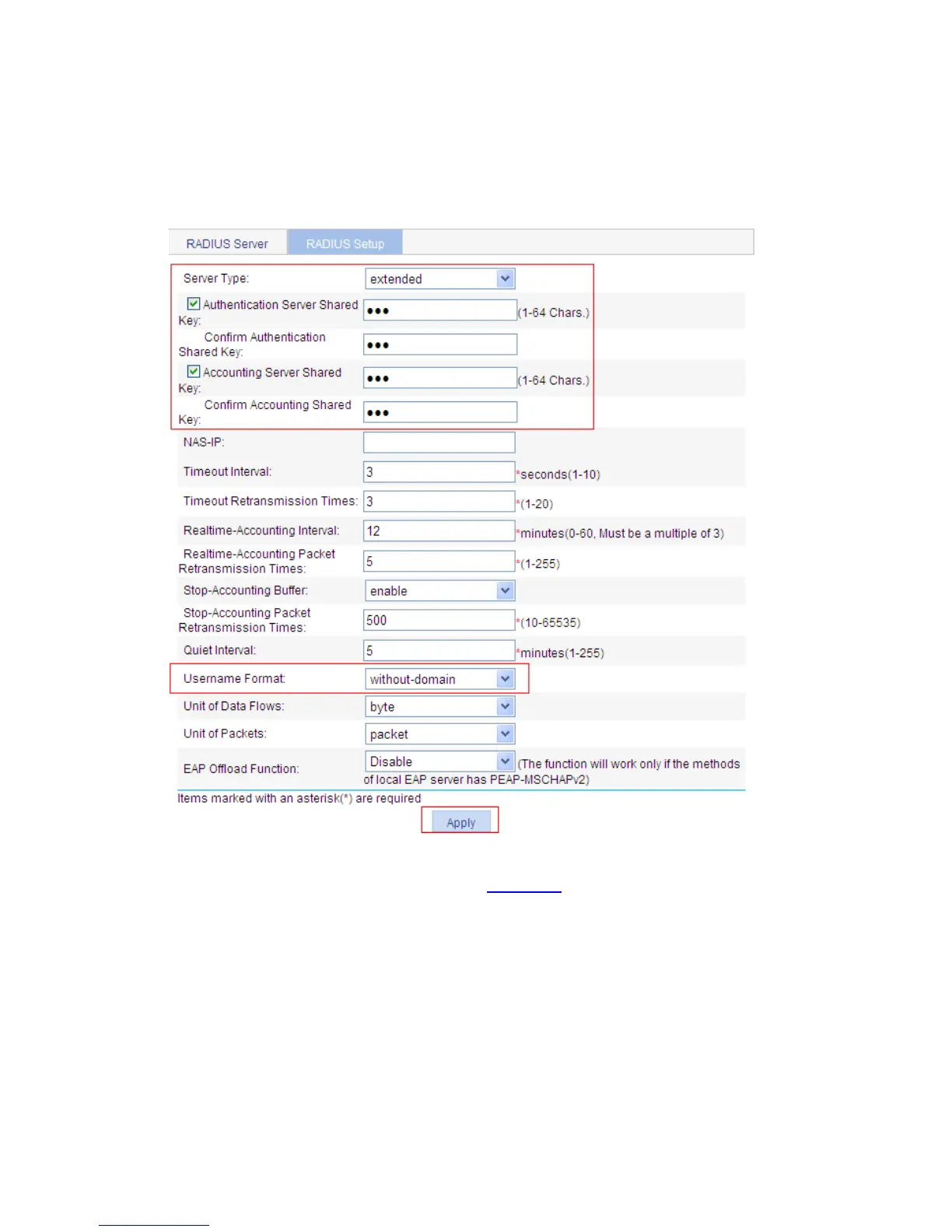 z Select the RADIUS Setup tab to enter the RADIUS parameter configuration page.