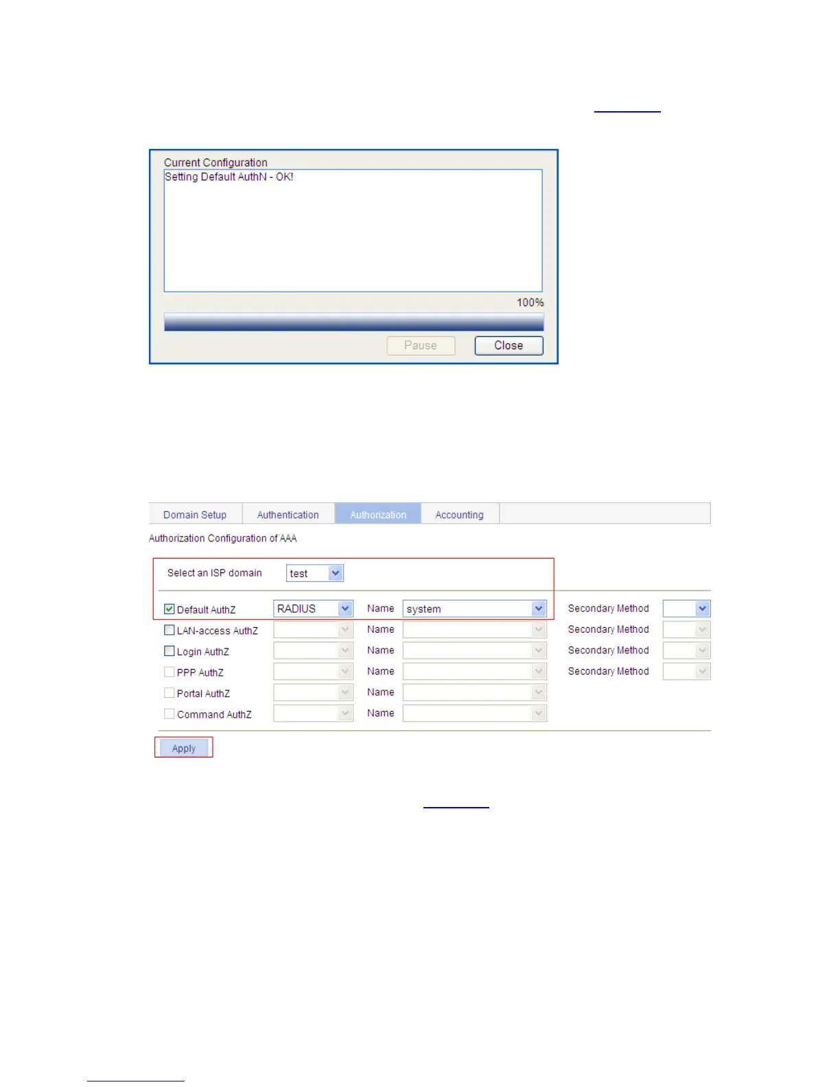 z Click Apply. The configuration progress dialog box appears.