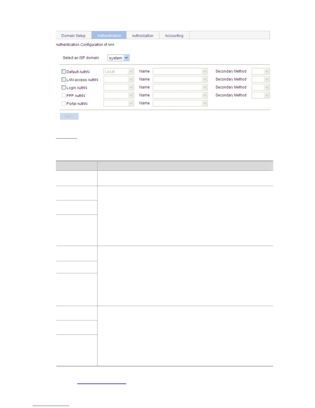 Table 1-3 describes the configuration items for specifying the authentication methods for an ISP