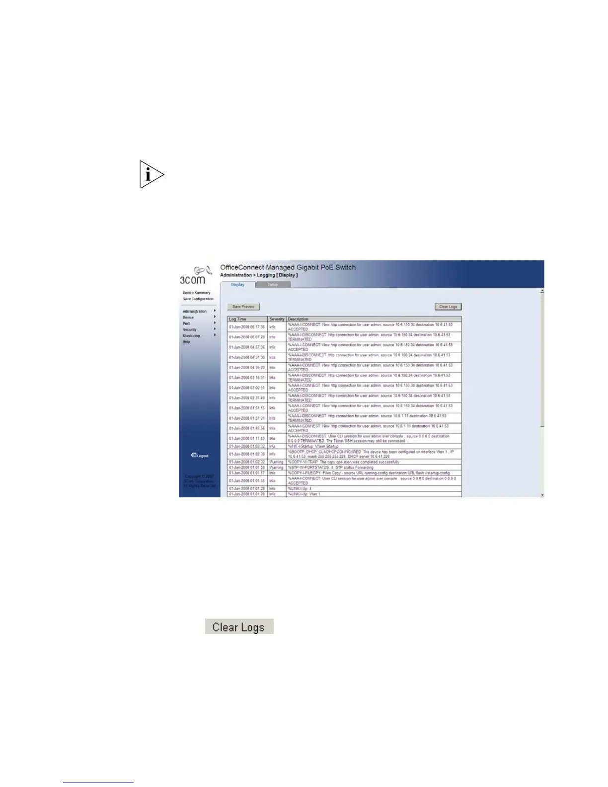 Viewing Logs The Logging Display Page contains all system logs in a chronological order