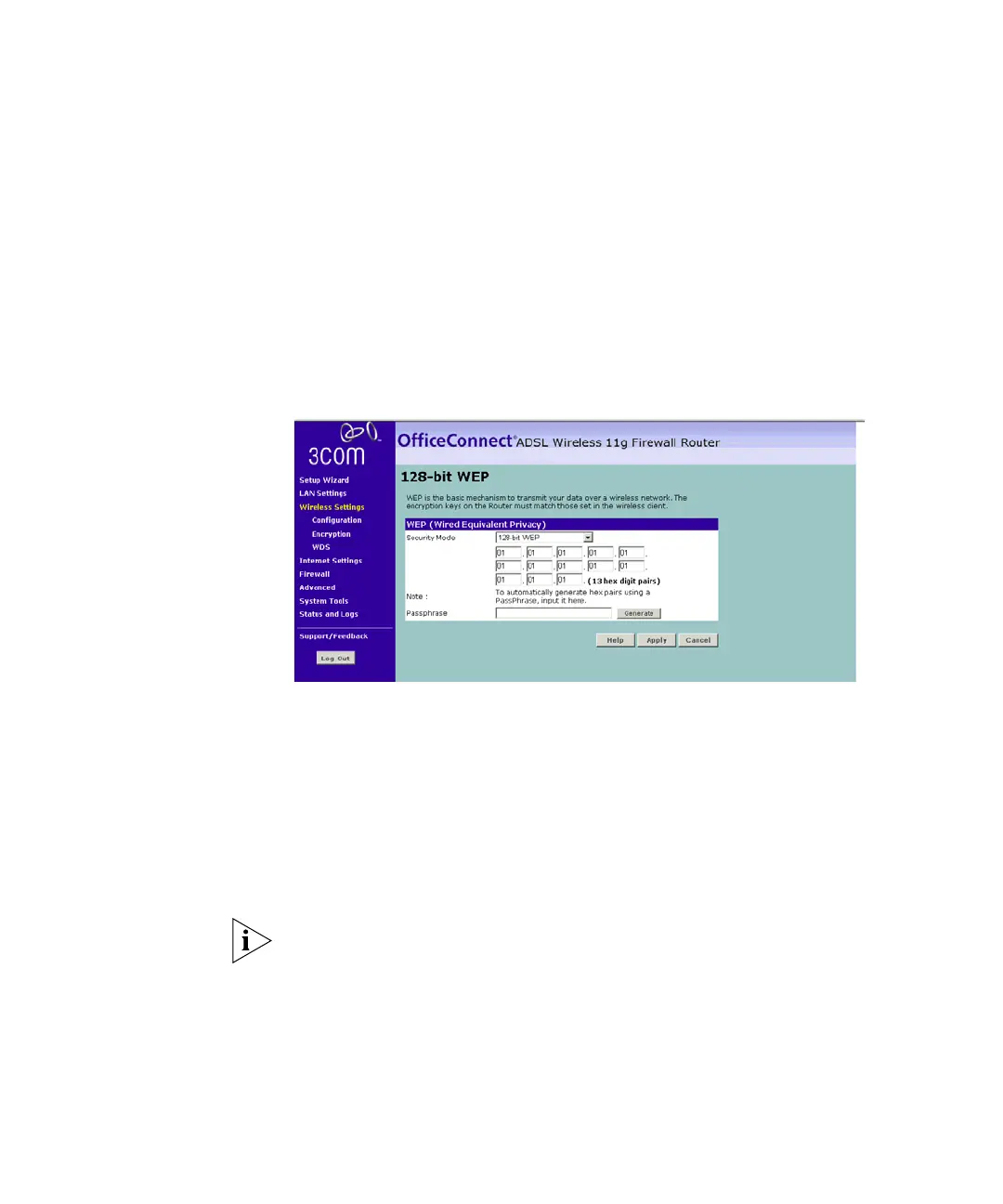■ enter your WEP key as 13 pairs of hex digits (0-9, A-F).