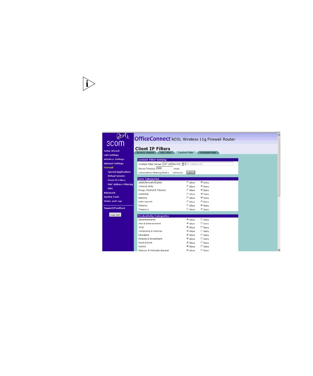 The Router comes with a 14-day free trial of the 3Com Content Filter