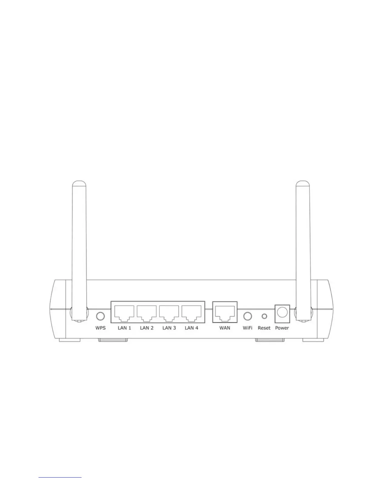 O painel traseiro do router contem um botão WPS, quarto portas LAN, uma porta WAN, um botão WiFi,