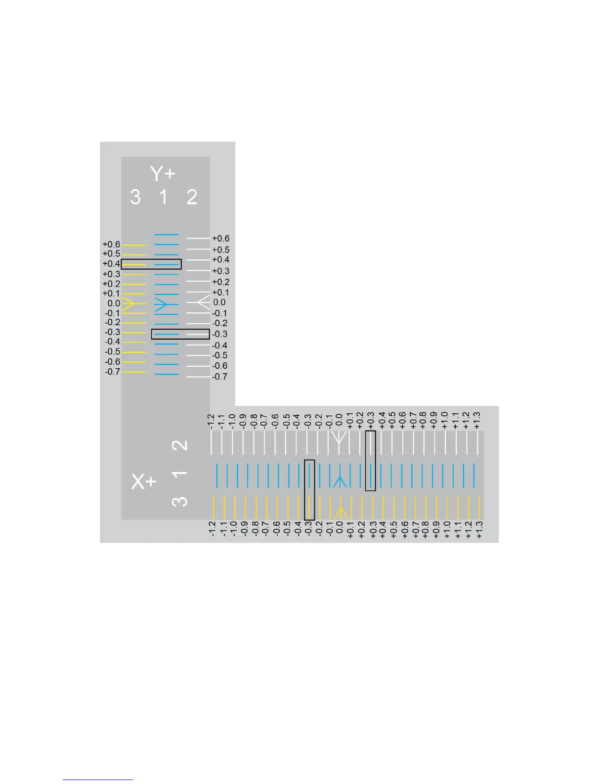 printed lines that are properly aligned, In this illustration, the lines at -0.3 are aligned. This means that the offset must be corrected by