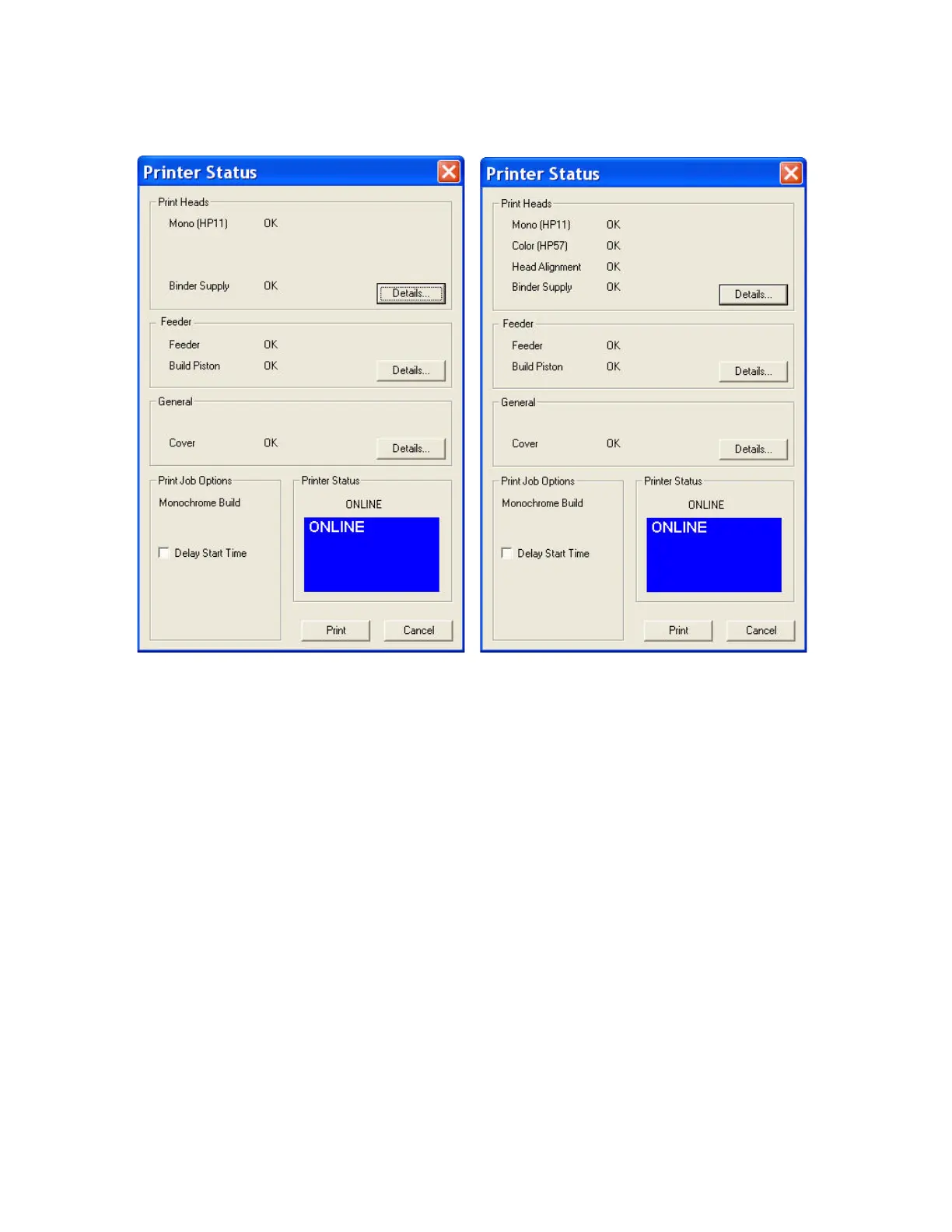 In the examples above, the Printer Status dialog shows the printer is ready for printing. Notice that