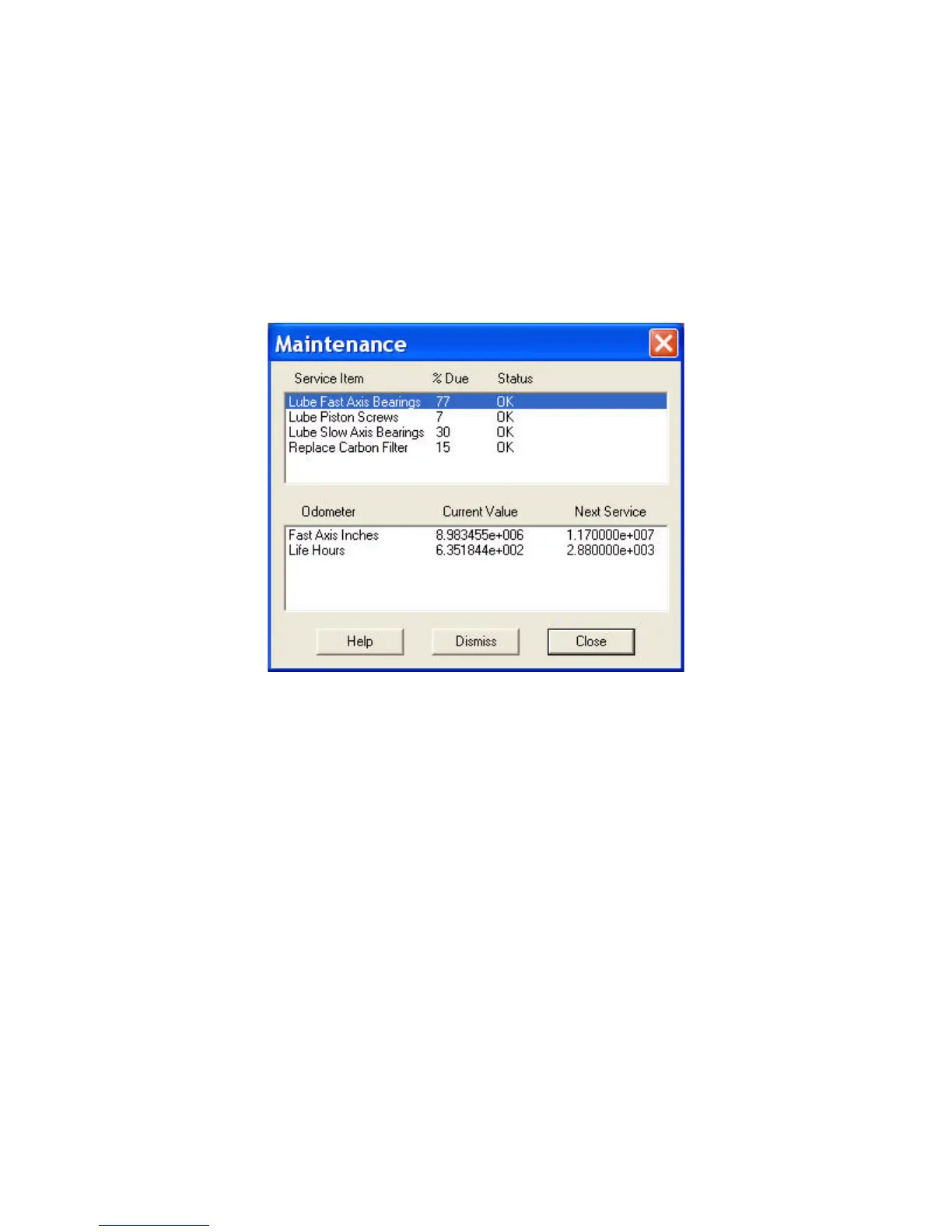 The Maintenance dialog (found on the 3DPrint Service menu) keeps a record of when the Fast Axis bear-