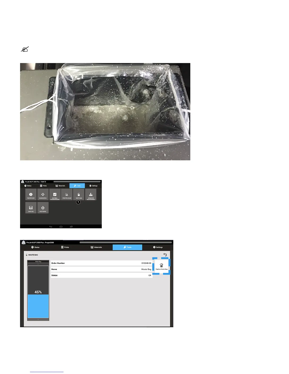 The UI will instruct the user when it is time to change the Waste Bag. Follow these steps to change the waste bag.