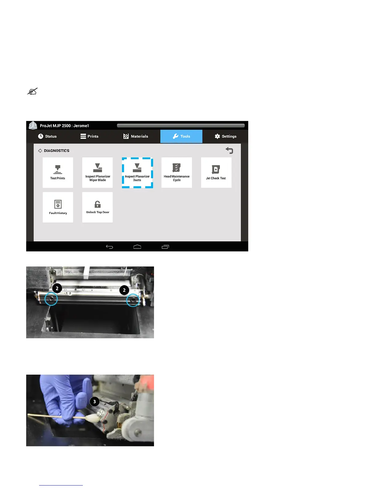 Carriage will move out of the way and planarizer assembly will tilt, allowing access to the ducts (2).2.