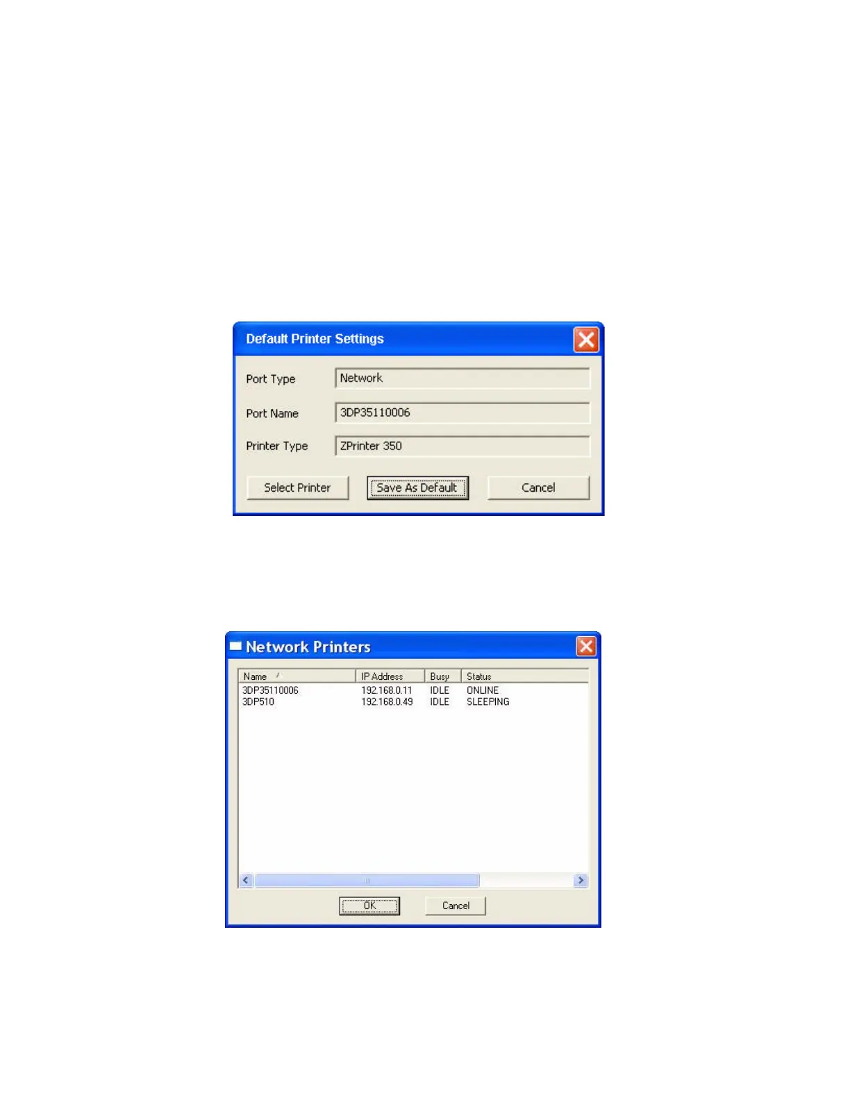 2. In the Default Printer Settings dialog, check that the default printer is the printer that is connected to