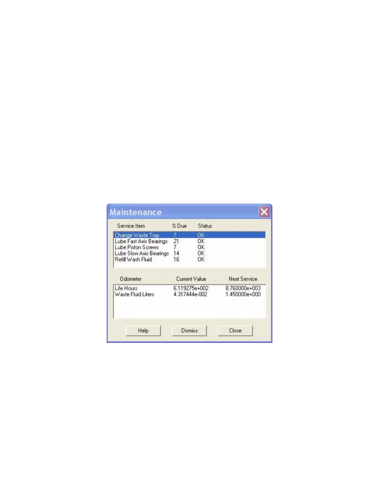 The Maintenance dialog (found on the ZPrint Service menu) keeps a record of when the Fast Axis bear-