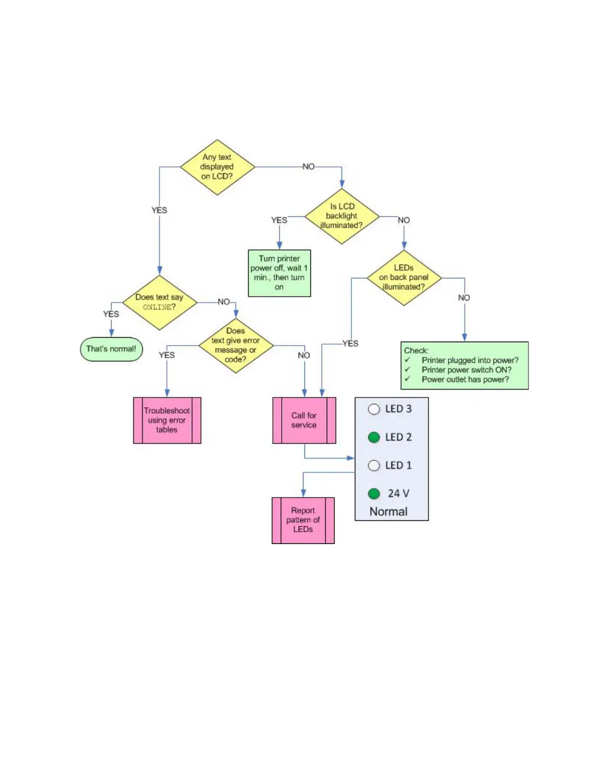 If your printer does not power up normally, use the flowchart below to isolate the problem.