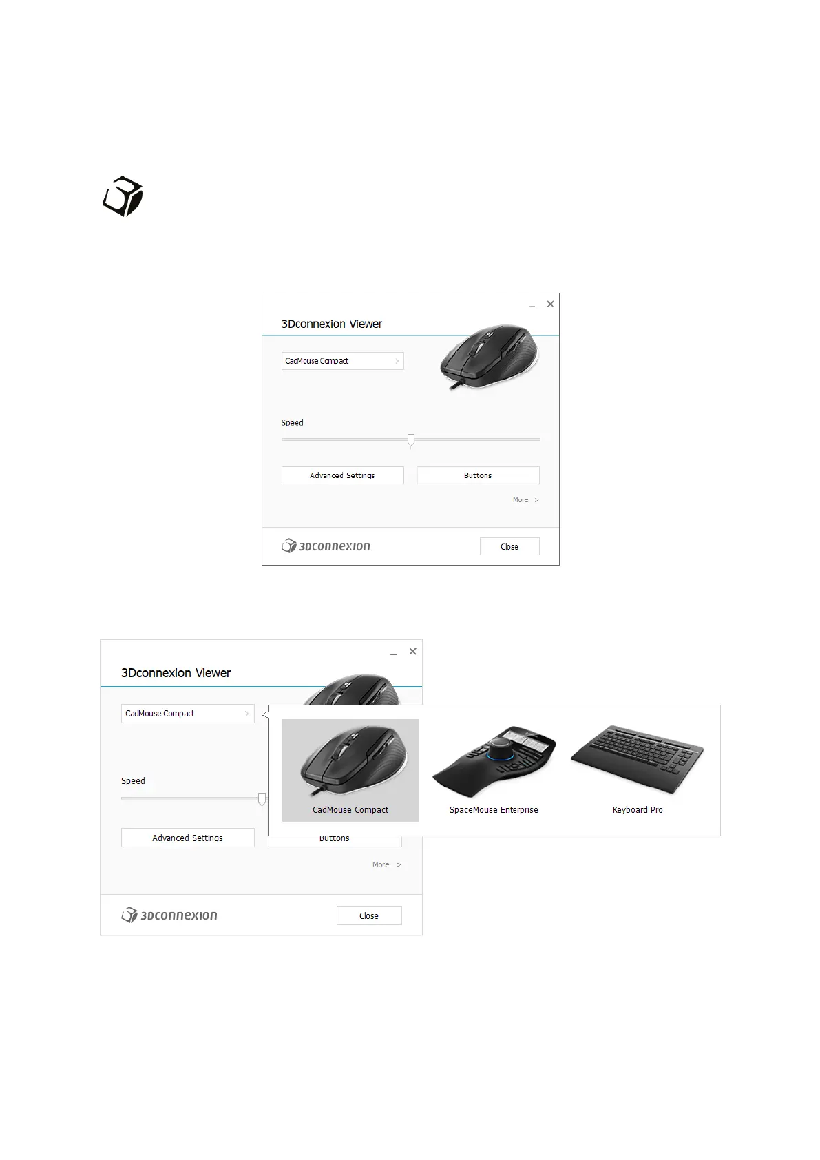 If multiple 3Dconnexion devices are connected, you can select the desired product to configure by clicking on the flyout button