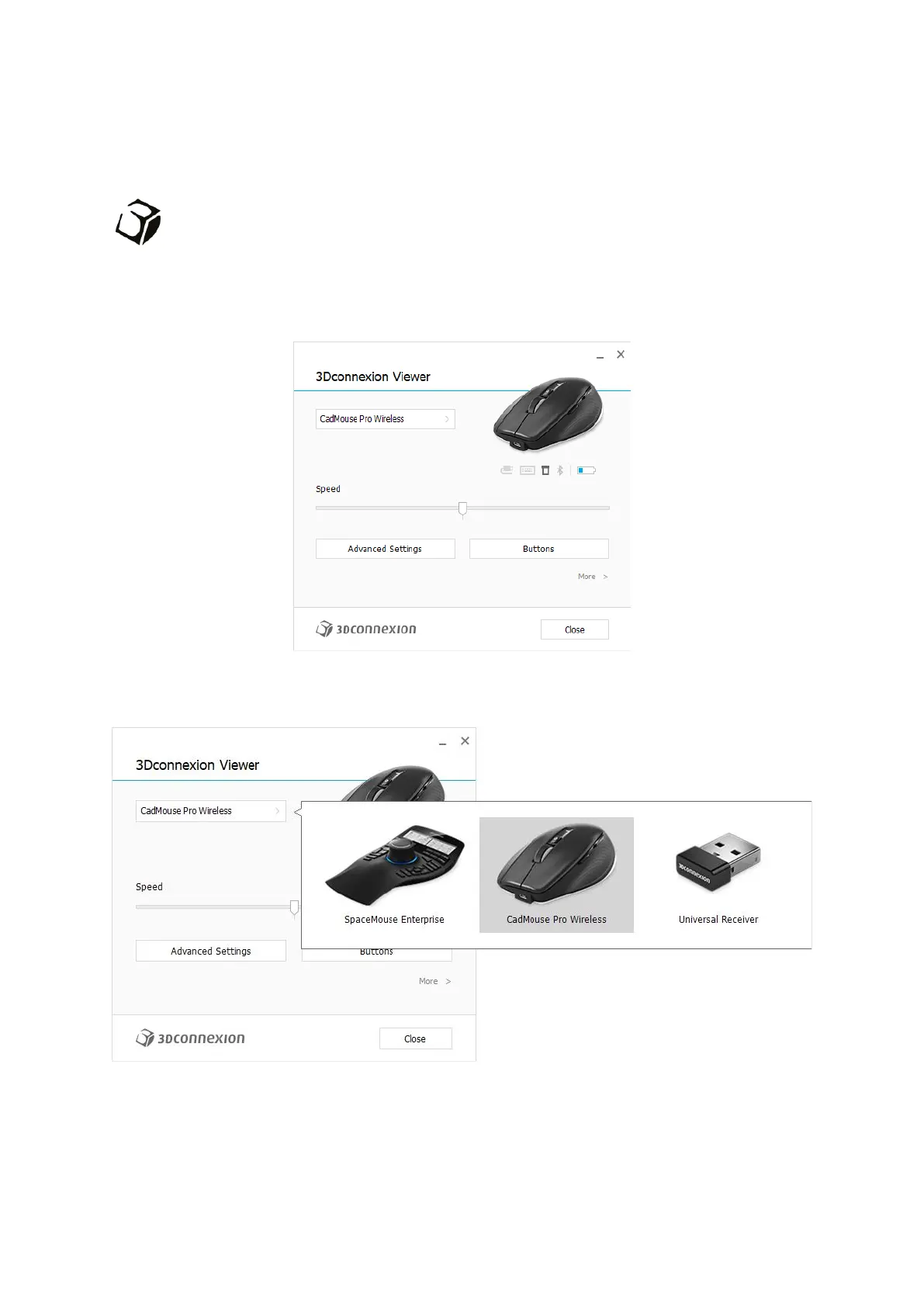 If multiple 3Dconnexion devices are connected, you can select the desired product to configure by clicking on the flyout button