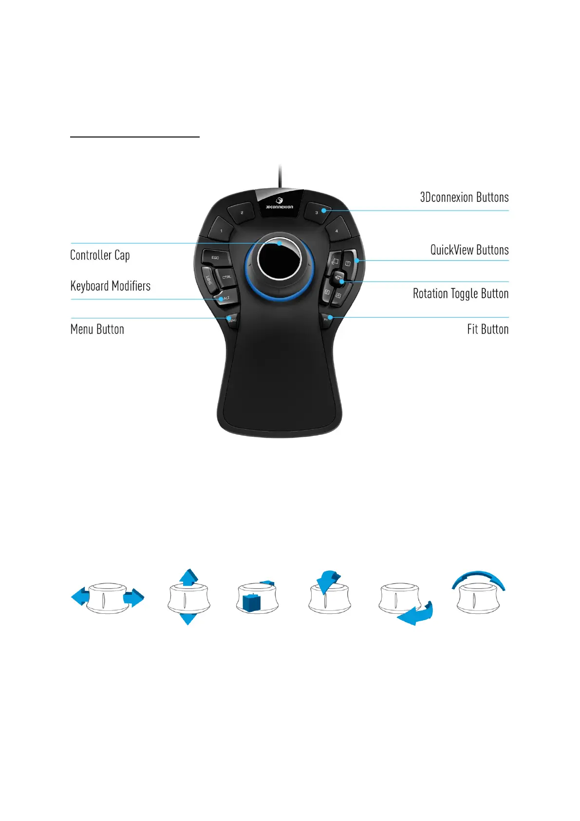 The Controller Cap is the heart of your SpaceMouse Pro. Its Six-Degrees-of-Freedom (6DoF) sensor allows you to push, pull,