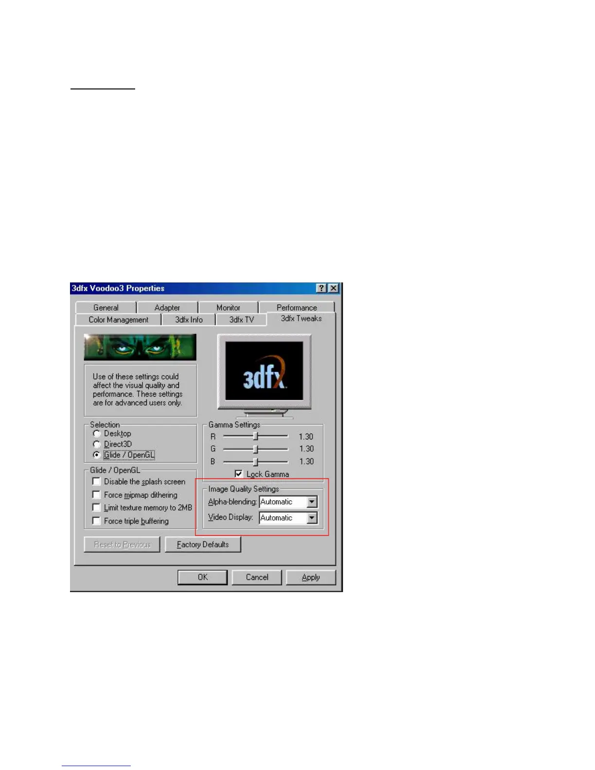 The new 3dfx Tweaks page is shown below. This page allows the user to customize the