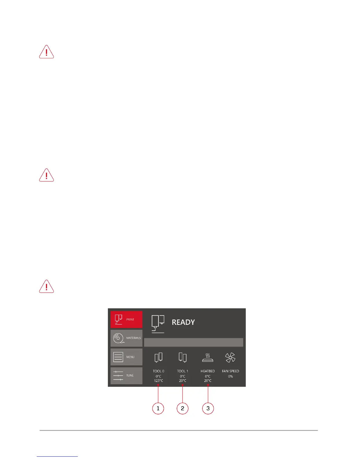 Fig. 2 Temperature indications for: 1, 2. hotends | 3. heatbed