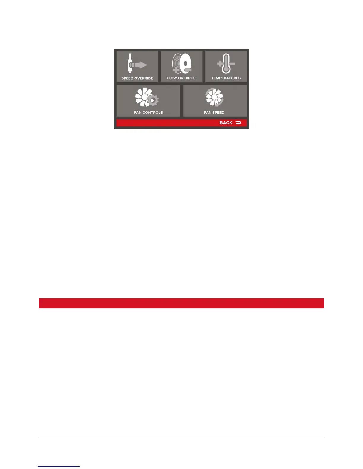 Fan Speed – allows for variable adjustment of current power levels of the print cooling fans.