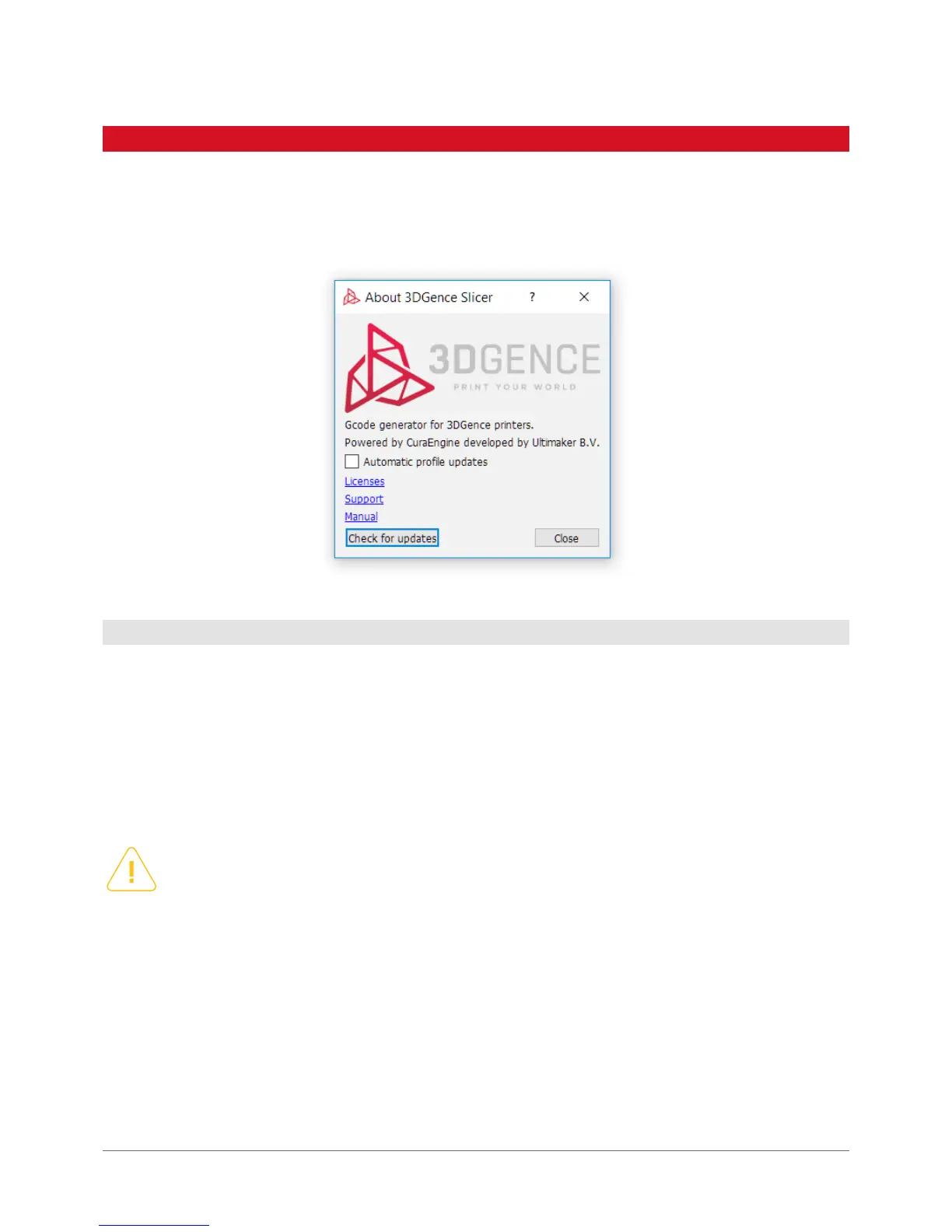 Under 3DGence button, you can nd the software information, direct link to the producer’s technical support, licence