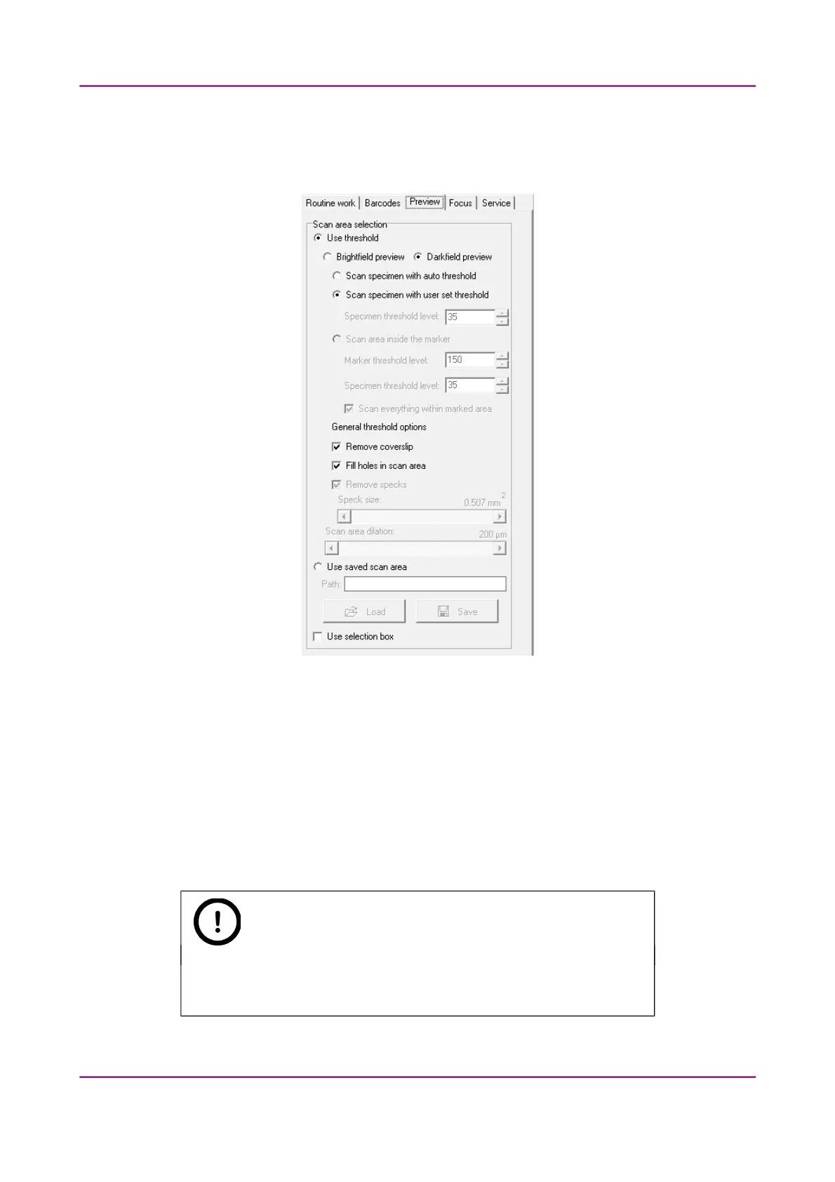 The Preview tab panel offers options for threshold setting and selection of the area to be scanned.