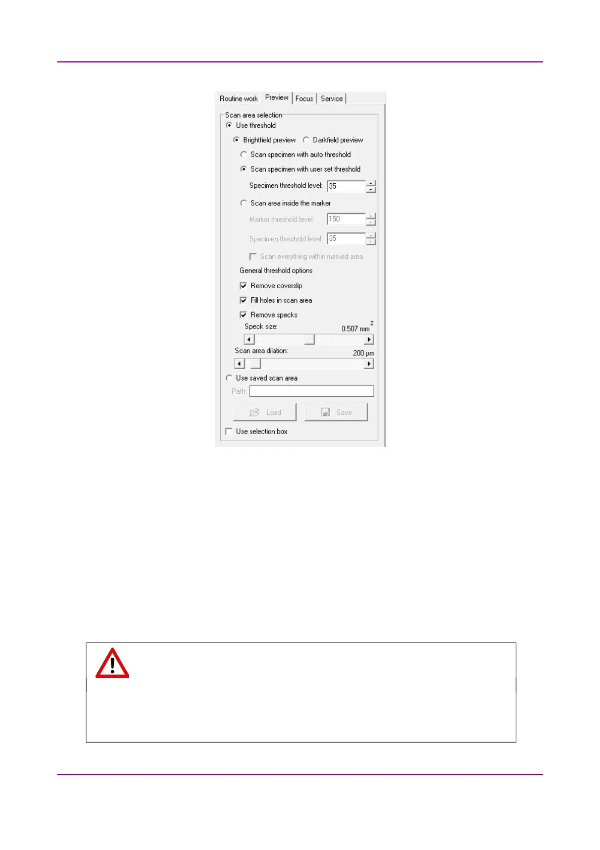 • Scan specimen with auto threshold – This automatically detects the specimen in