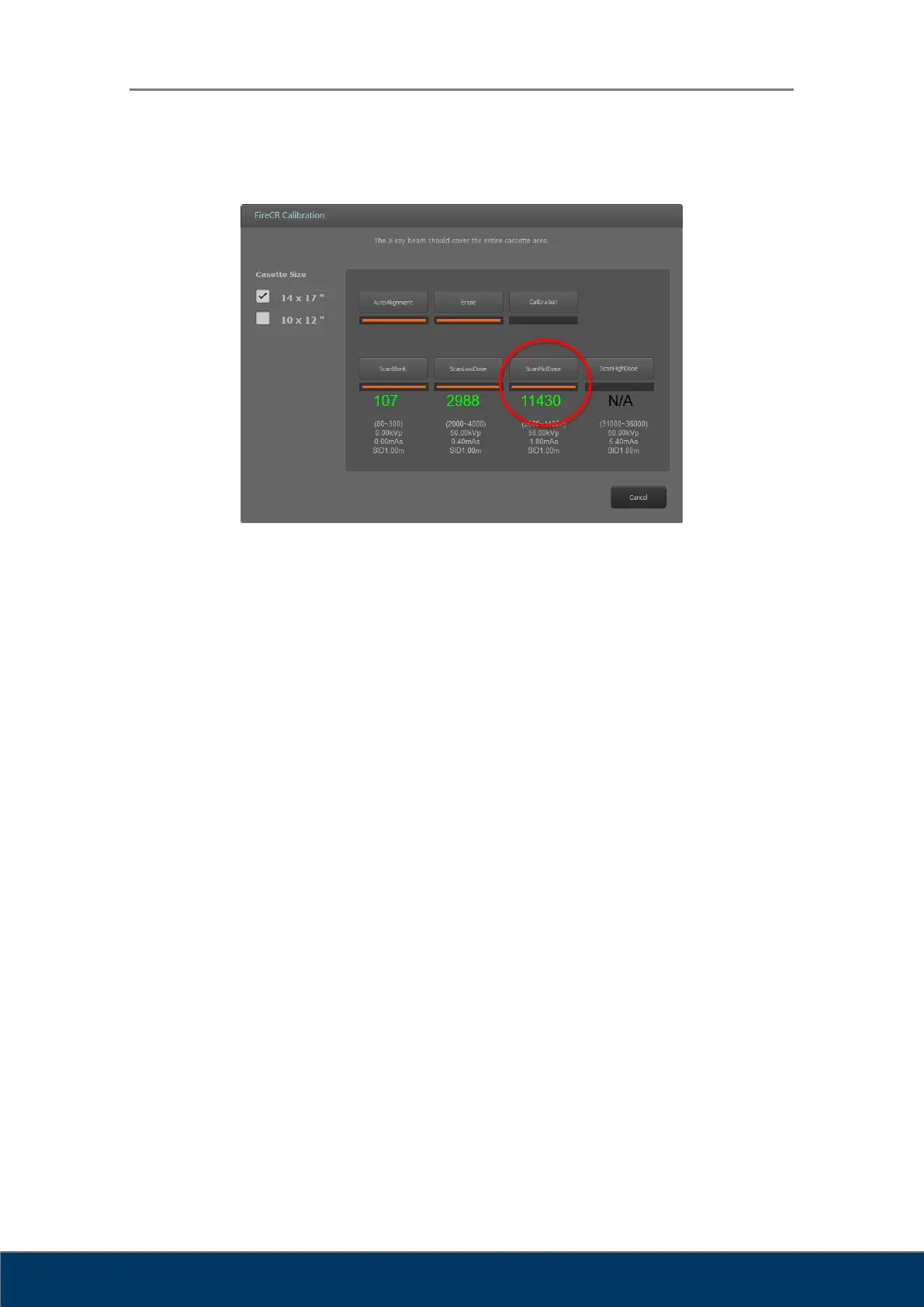Expose the cassette to the X-ray with the conditions noted below the Scan Mid Dose