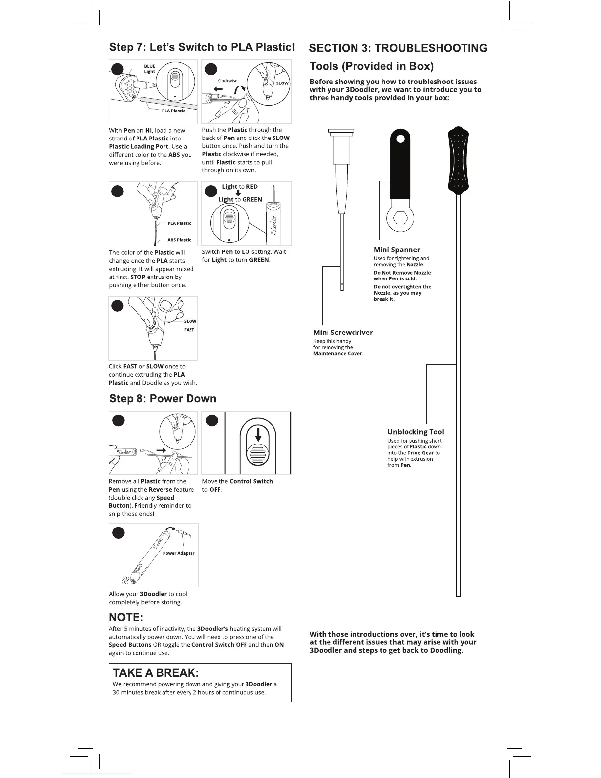 3Doodler Create - Switching and Powering Down; Switching to PLA Plastic; Safe Power Down Procedure; Automatic Power Down Feature
