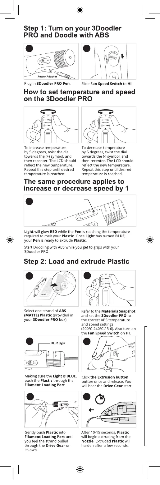 3Doodler PRO - Step 1: Powering On and Initial Doodling; Adjusting Temperature and Speed Settings; Beginning Doodling with ABS; Step 2: Loading and Extruding Plastic