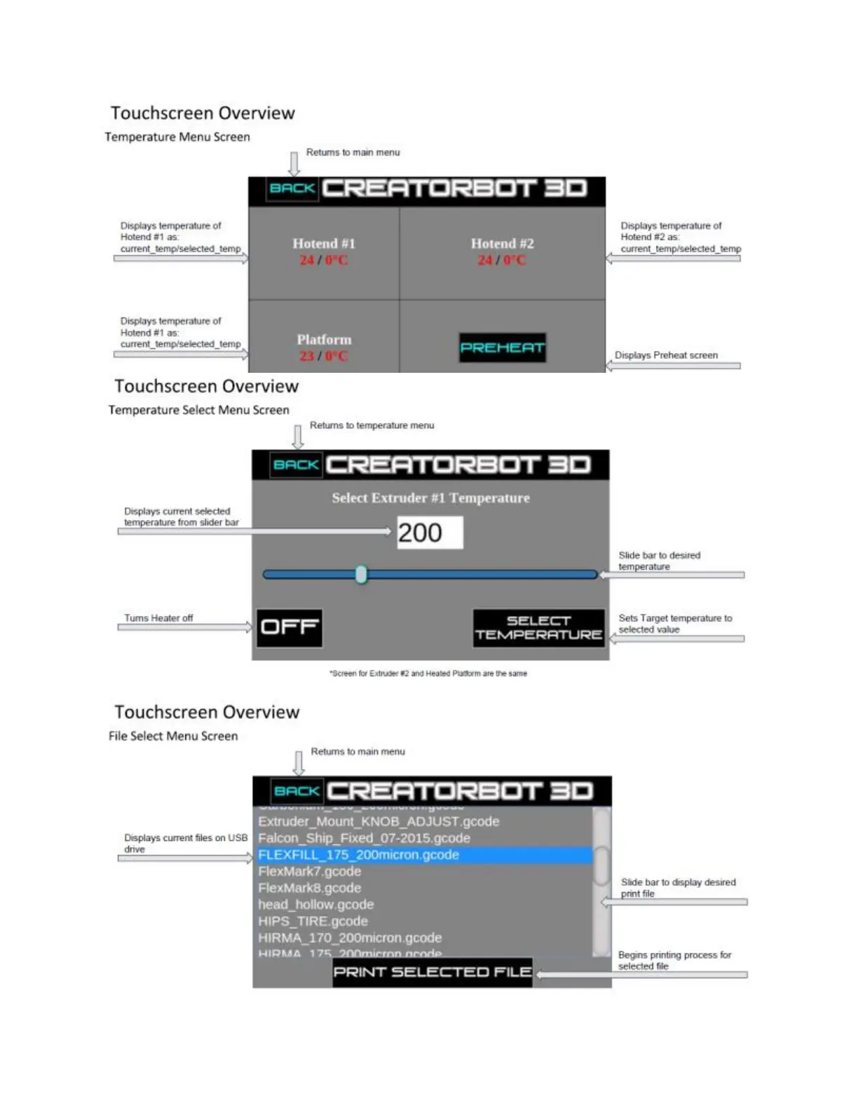 3DPrinterWorks CreatorBot 3D Pro II Series - Temperature Menu Screen; Temperature Select Menu Screen; File Select Menu Screen