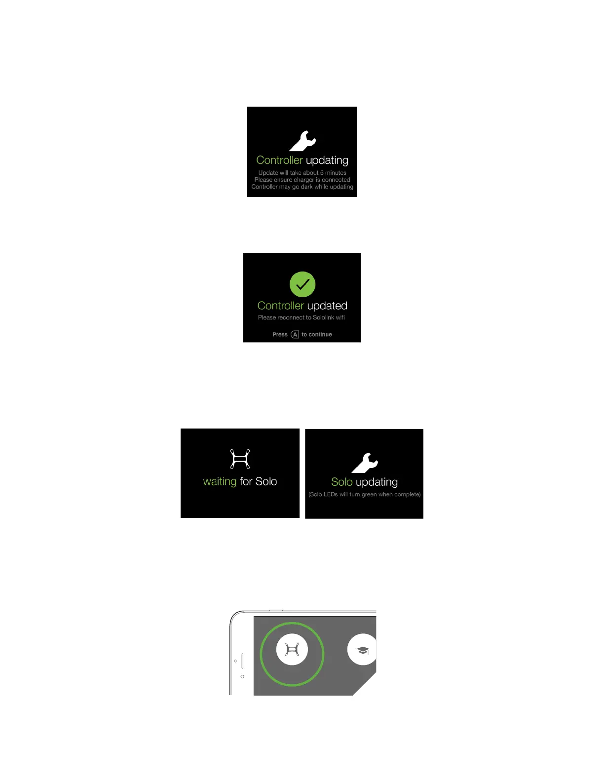 the update is in progress. When the update is complete, Solo’s LEDs will display green and the controller will return