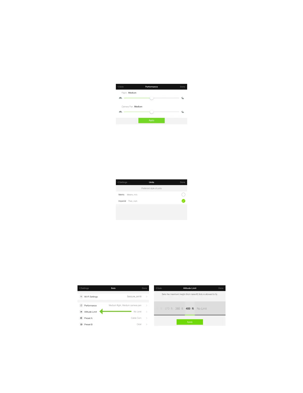Pour ajuster la limite d’altitude, choisissez Altitude Limit (Limite d’altitude) à partir du menu Solo. Quand vous