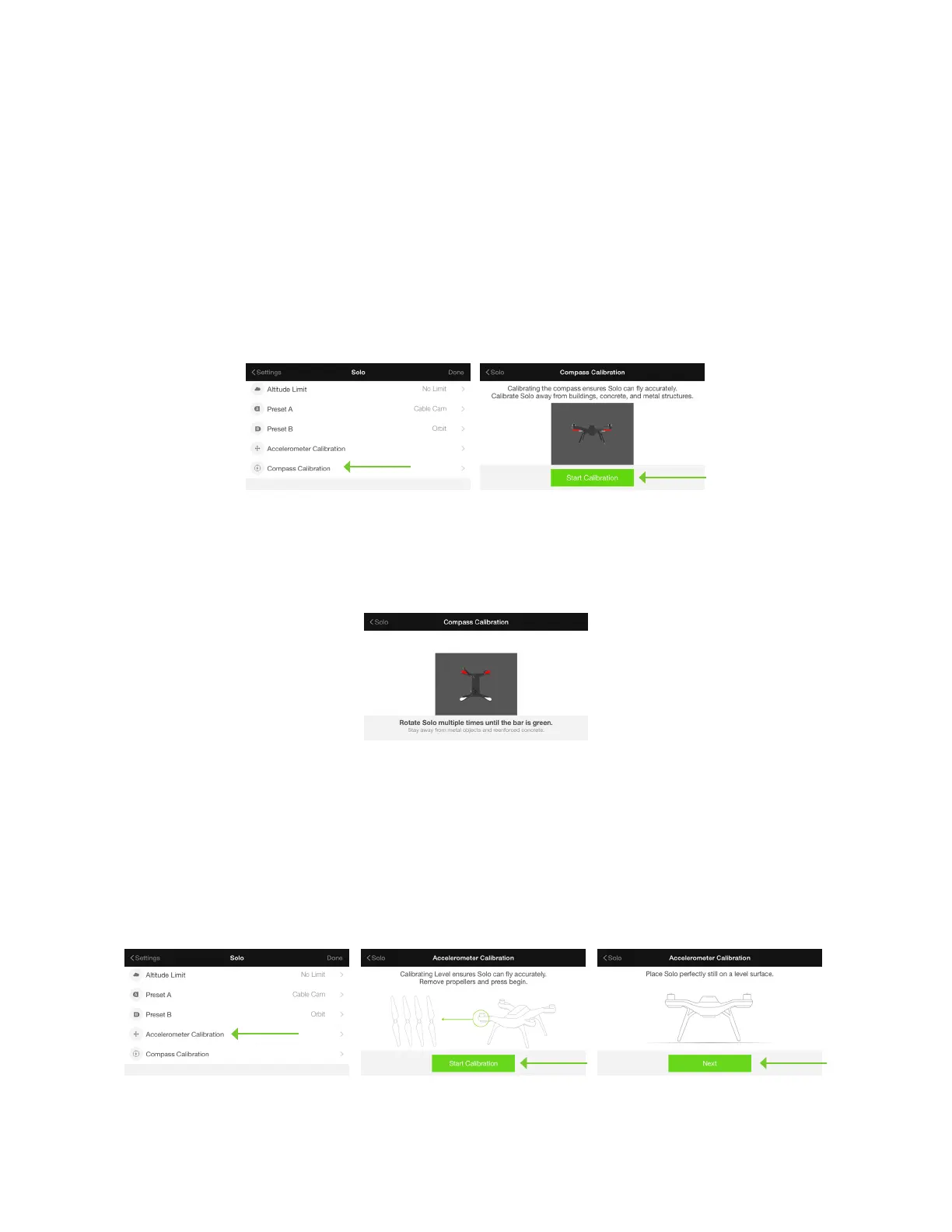 (Calibrage de la boussole) à partir du menu Solo. Vérifiez que Solo et la manette sont sous tension et que les hélices