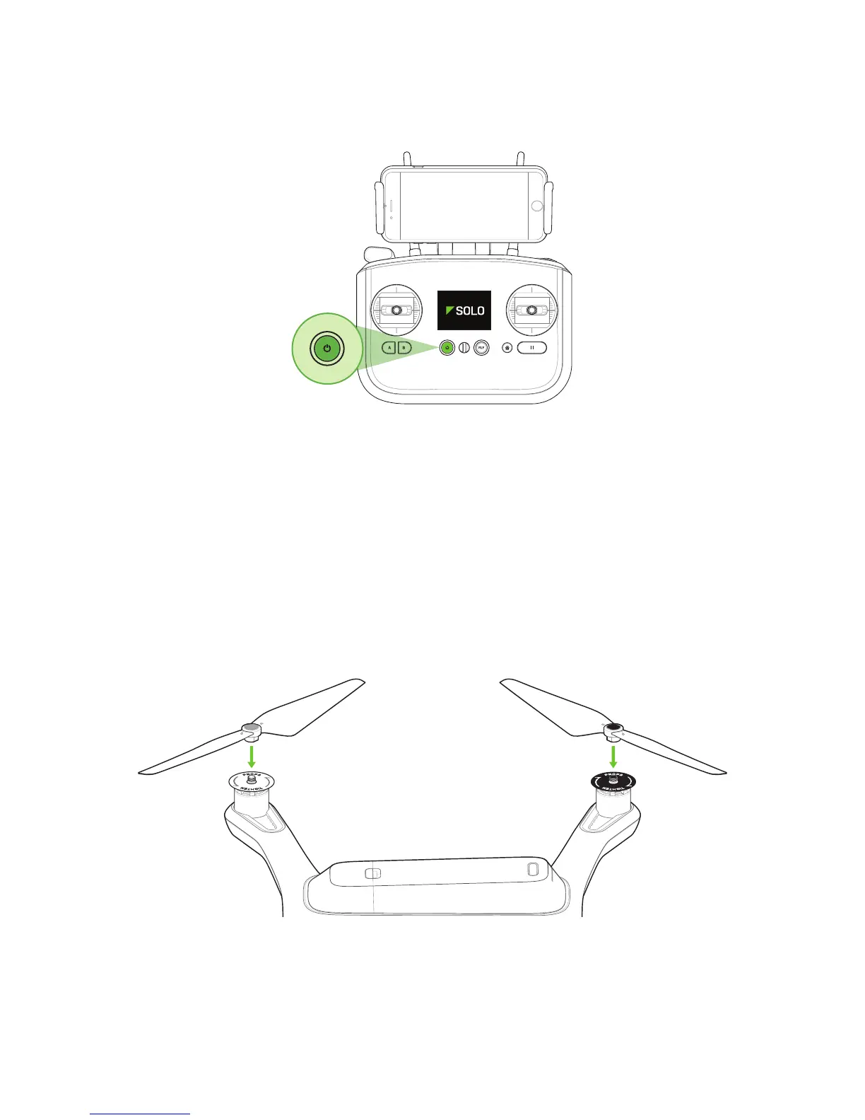 Solo uses two types of self-tightening propellers, indicated by the color of the circle at the center of the propeller.