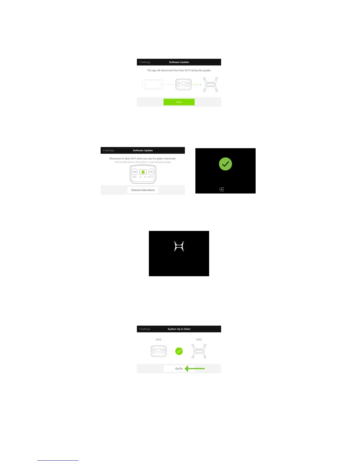 When the update is complete, Solo’s LEDs turn green, the controller returns to the standard takeoff screen, and the