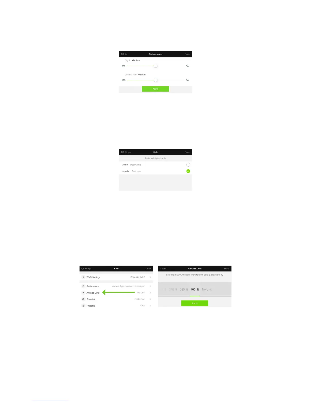 To adjust the altitude limit, go to Settings, choose Solo, and then select Altitude Limits. Scroll the list horizontally to