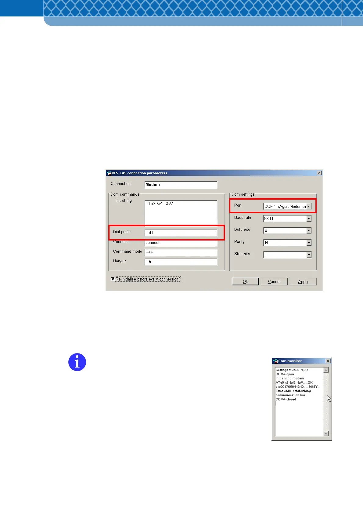 (4) In the modem’s connection settings select the COM port. In the “Dial prefix” field enter