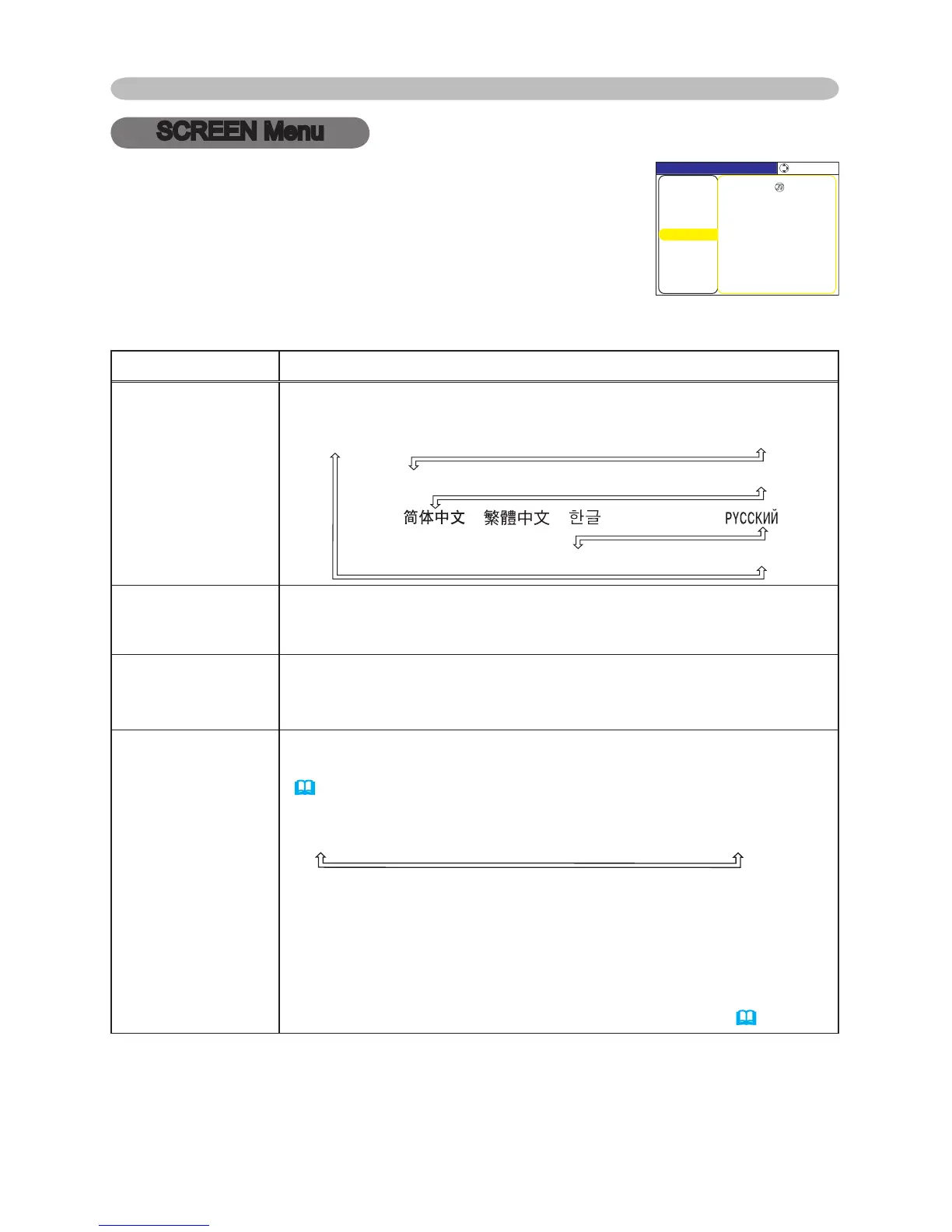 With the SCREEN menu, the items shown in the table