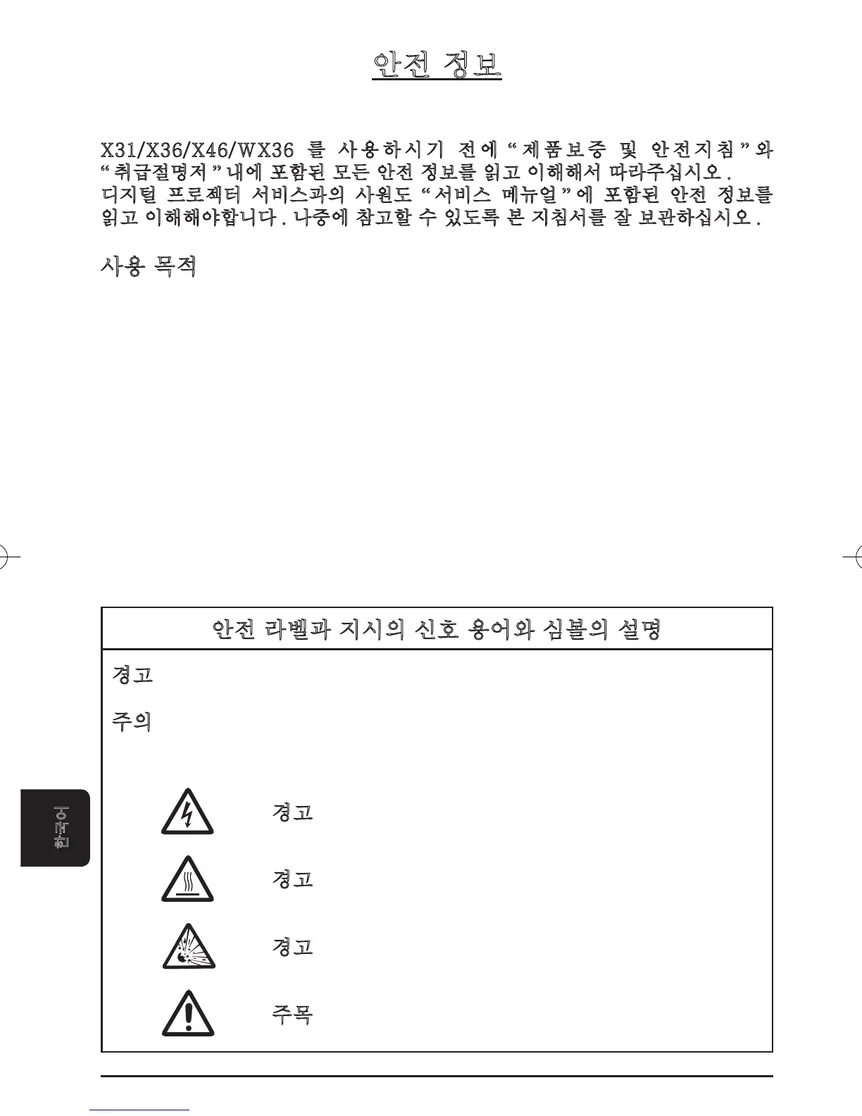 며 프로젝터와 주변 장치를 손상시킬 수 있고 작동 환경의 잠재적인 위험을 유발할 수 있