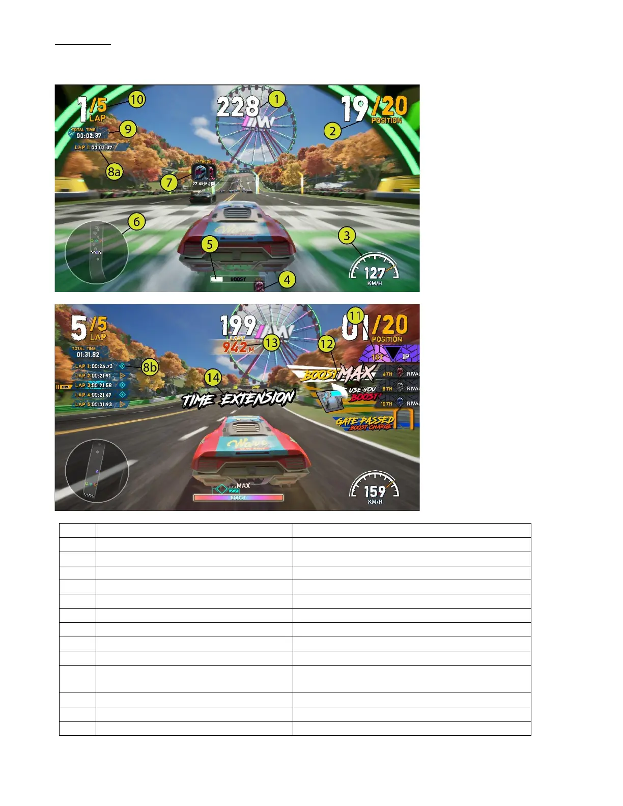 During the race, data of the race will be displayed around the screen.