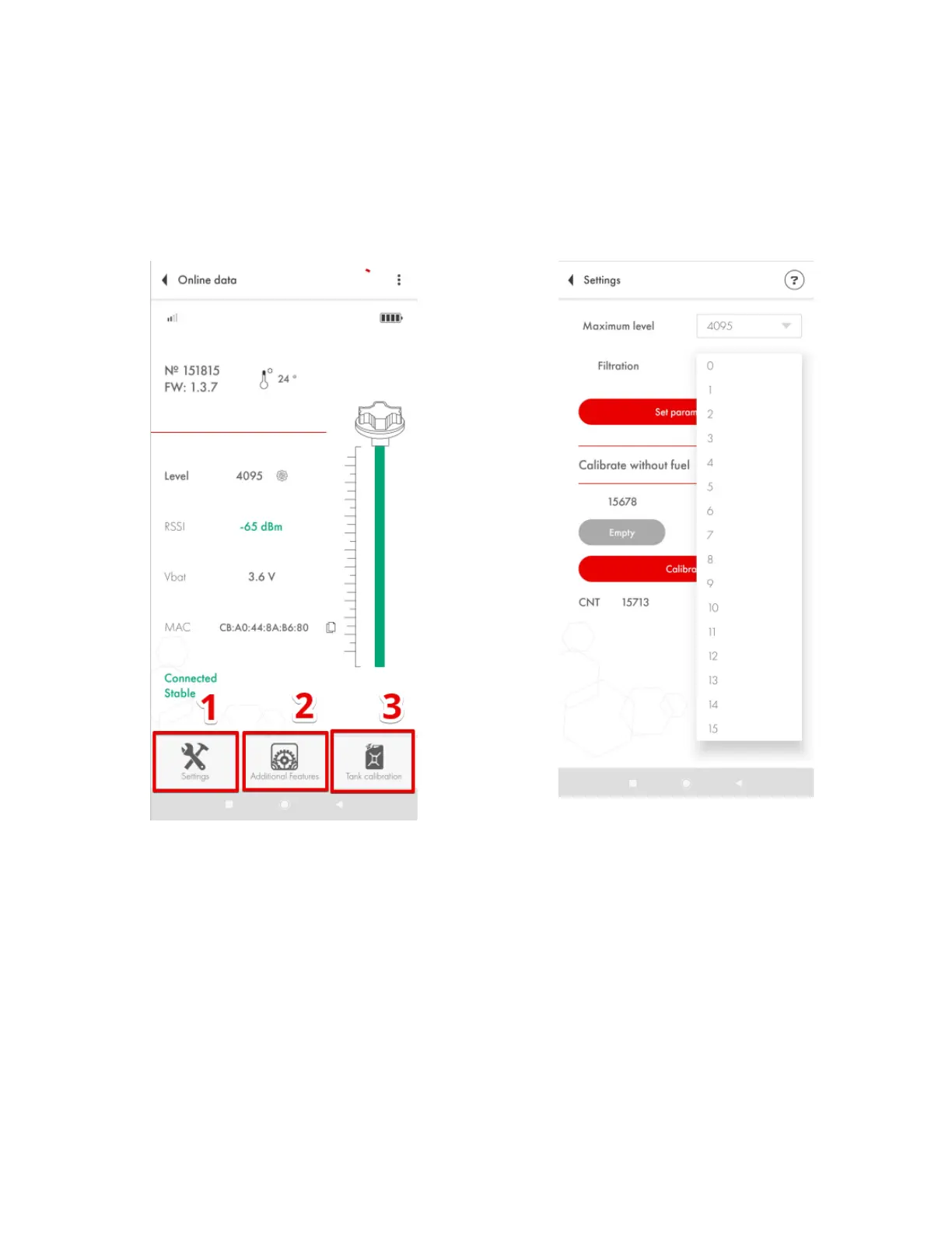 After the tank calibration is over, select the level of Filtration (Fig. 70) in the Settings