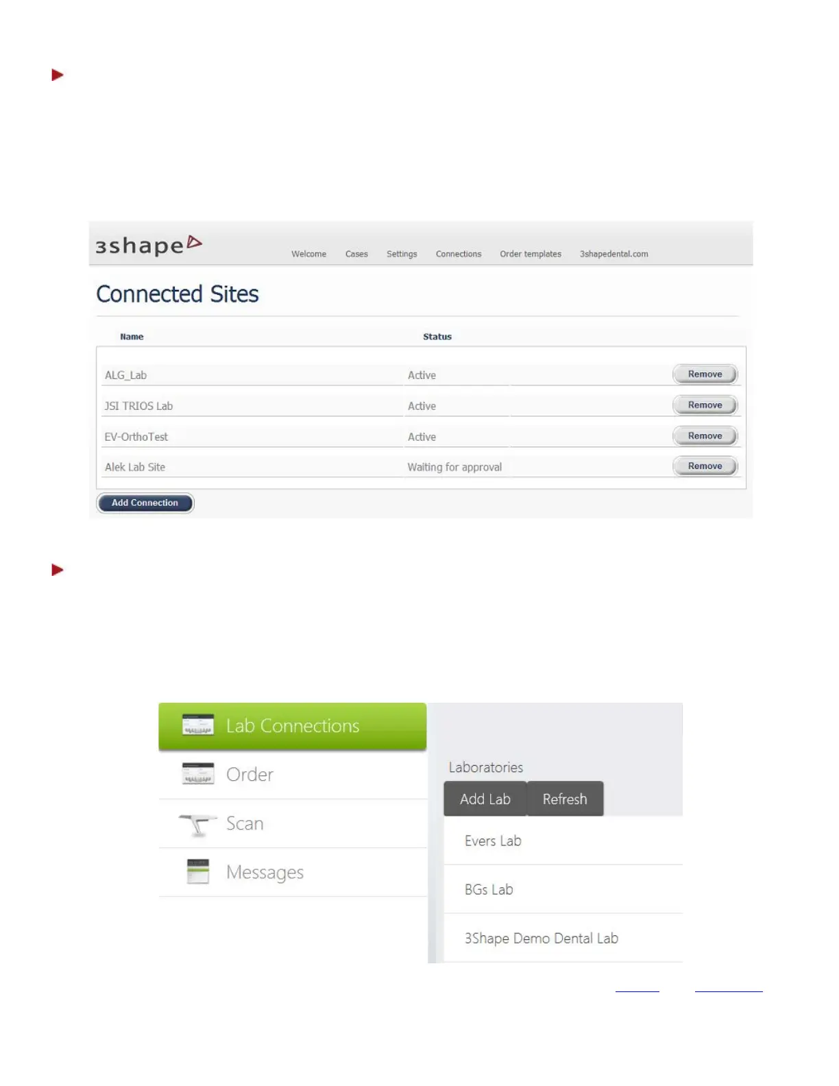 the list of added labs in your TRIOS system. If you added a lab from a remote PC, press Refresh to