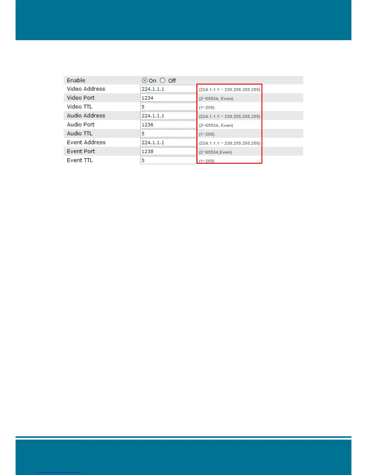Set up the IP address to transfer the Video package. The default setting is 224.1.1.2.