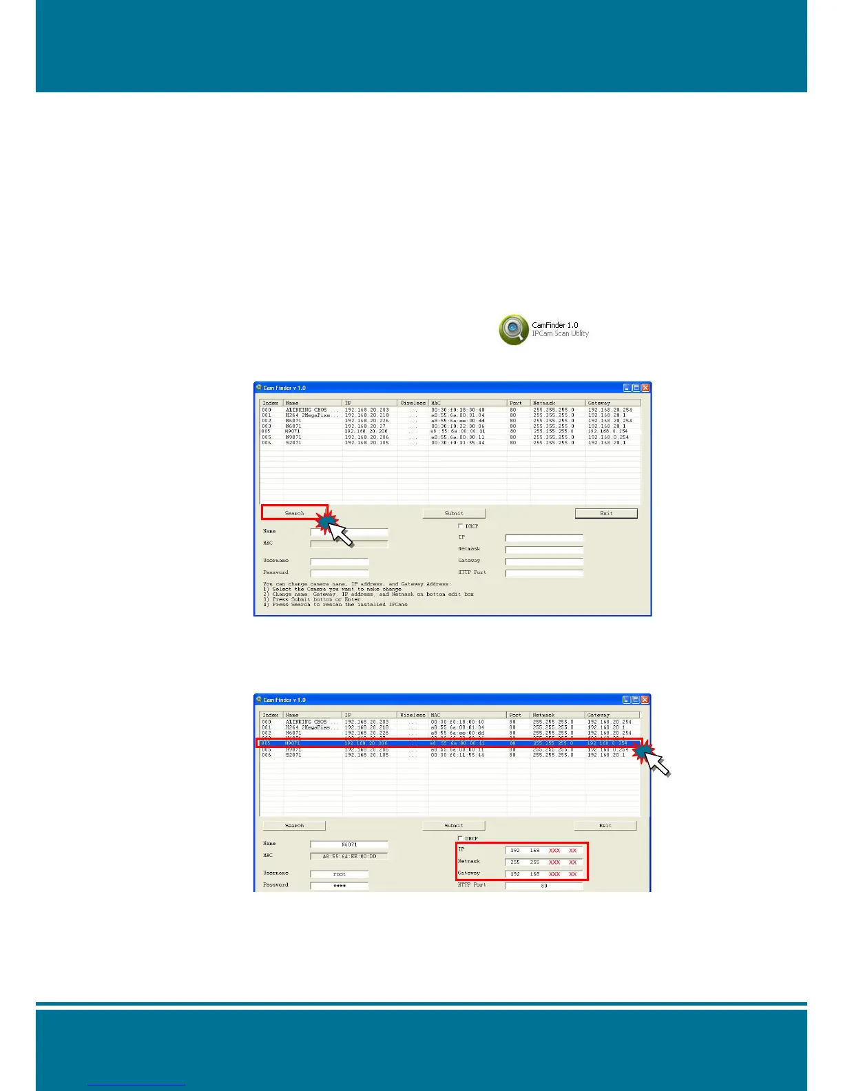 run the “Cam Finder.exe” following the steps below to search and change the IP address of